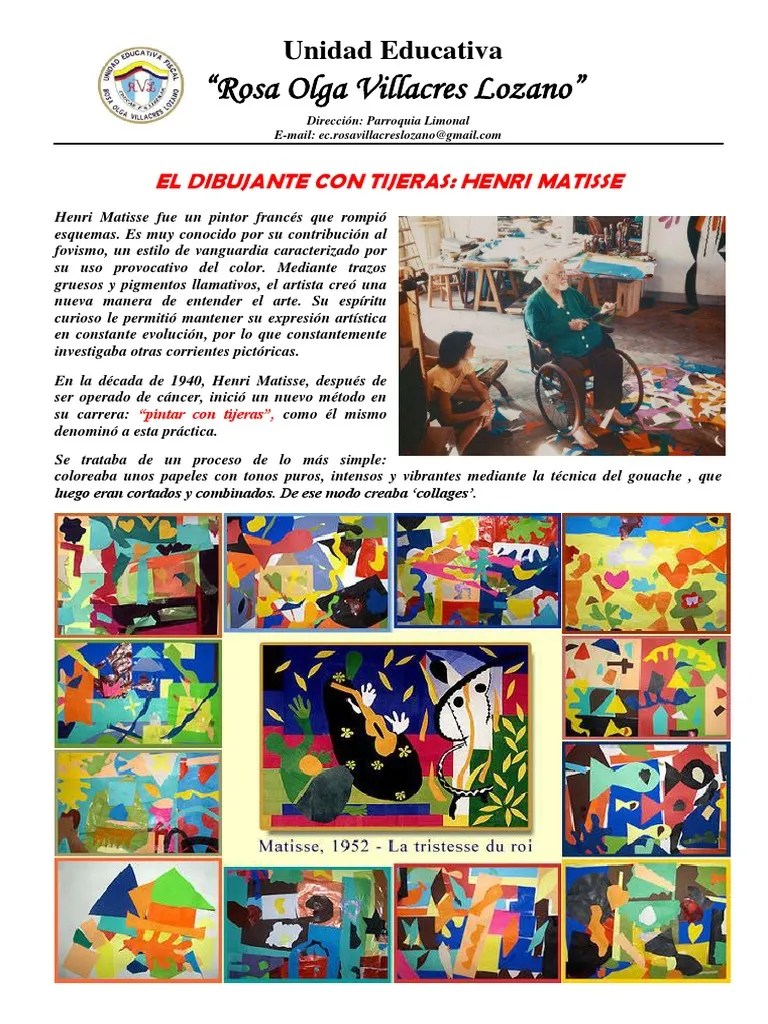 Tijeras, papel y pegamento y con ellos se embarcó en uno de sus proyectos más vitalistas y personales. En estos últimos años sus utensilios de trabajo dejaron de ser el lienzo, el caballete y los pinceles. En 1941 una delicada operación quirúrgica dejó postrado a matisse en una silla de ruedas, algo que le impedía pintar como lo había hecho. La técnica que ideó para dar respuesta a ese problema es la de pintar con tijeras, un nuevo lenguaje visual elaborado a base de recortes de papel pintados en tonos. Tijeras, papel y pegamento y con ellos se embarcó en uno de sus proyectos más vitalistas y personales.. 13.01.2020 · en la década de 1940, henri matisse, después de ser operado de cáncer, inició un nuevo método en su carrera: